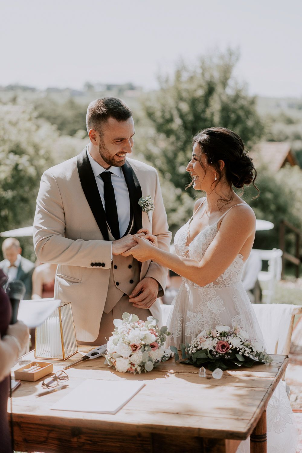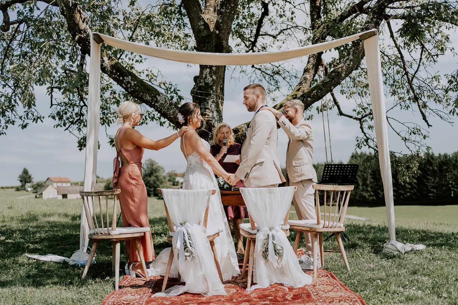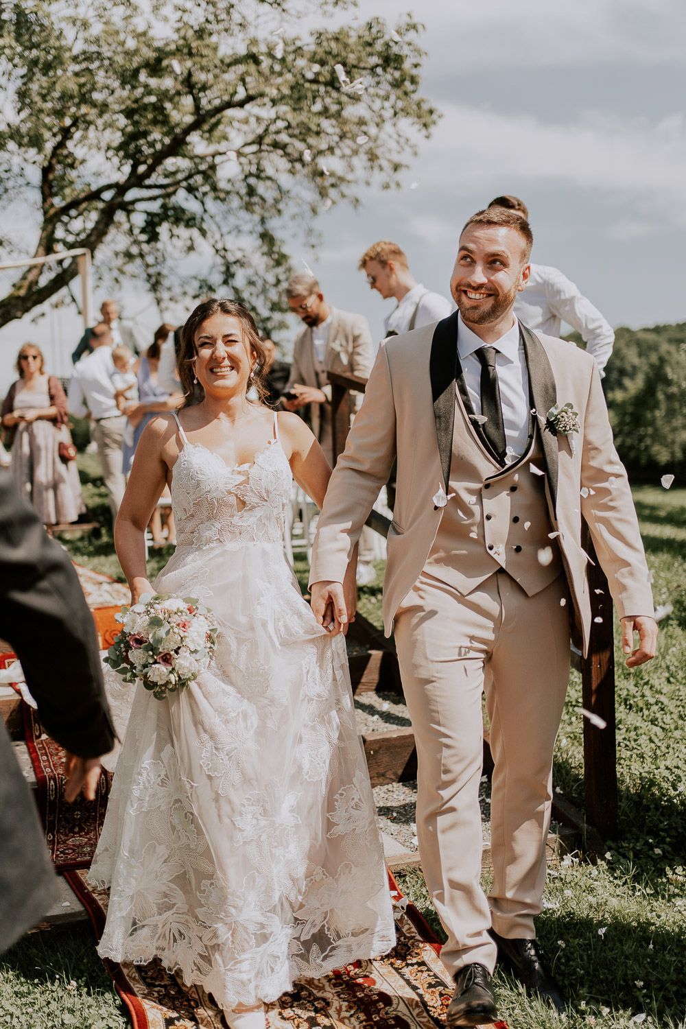 Melissa und Peter haben ihren großen Tag im wunderschönen Ambiente des Weinguts Holler gefeiert – eine perfekte Mischung aus rustikal und elegant. Die Trauung fand unter einem schattigen Baum statt, liebevoll dekoriert mit türkischen Teppichen, die Melissas Wurzeln widerspiegelten. Für die anschließenden Paarfotos sind wir mit einem Golfcart durch den Weingarten gedüst und haben entspannte Momente der Zweisamkeit eingefangen. Danach wurde in der charmanten Scheune weitergefeiert und der Abend endete mit viel Lachen, , ausgelassenen Tanzen und guten Gesprächen - dem perfekten Ausklang für einen lauen Sommerabend.